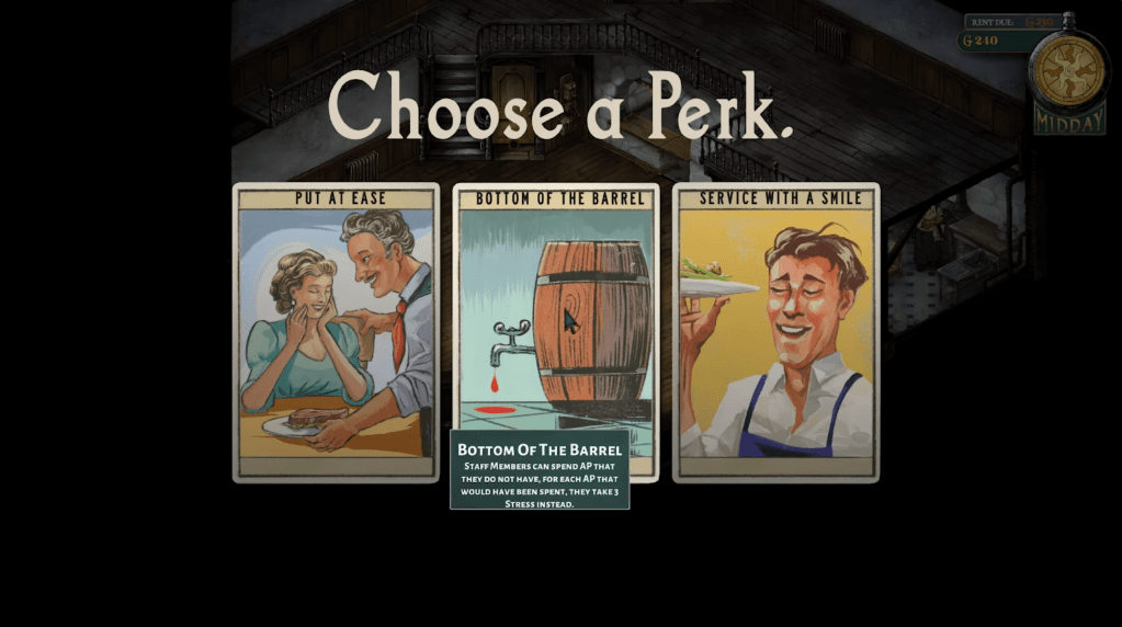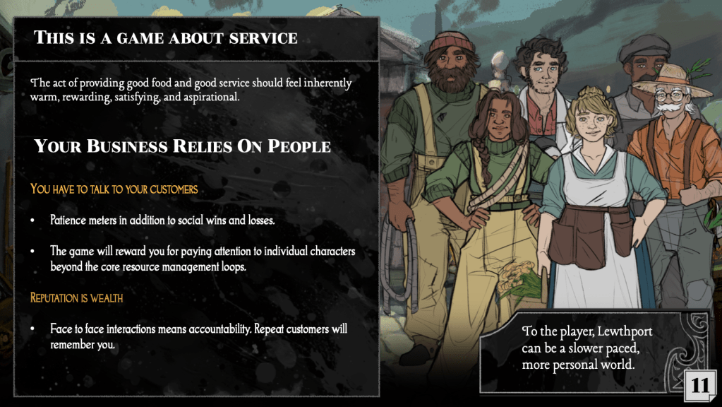 Where Pale was a narrative-first production, Hearth is very much mechanics-first, and knowing these principles helped us design what was important to the game early on. In a game about people, ensuring that the customers you served were their own characters was essential, so everyone you meet is a unique design. All 70 of them have personalities and preferences, and many of them have relationship pathways – some potentially intimate (eyes emoji)… It was also important that any favour you gained with those around you was meaningful, so the stronger your community, the more people are willing to help you out, to offer you boons to gameplay (discounts or service perks) or shield you from consequences (coming to your aid if you’re low on rent).